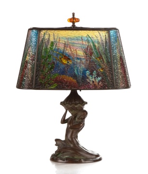 Circa 1910. Rippled glass aquarium shade. Signed 'Handel 7538 Bedigie'. On mermaid base. |