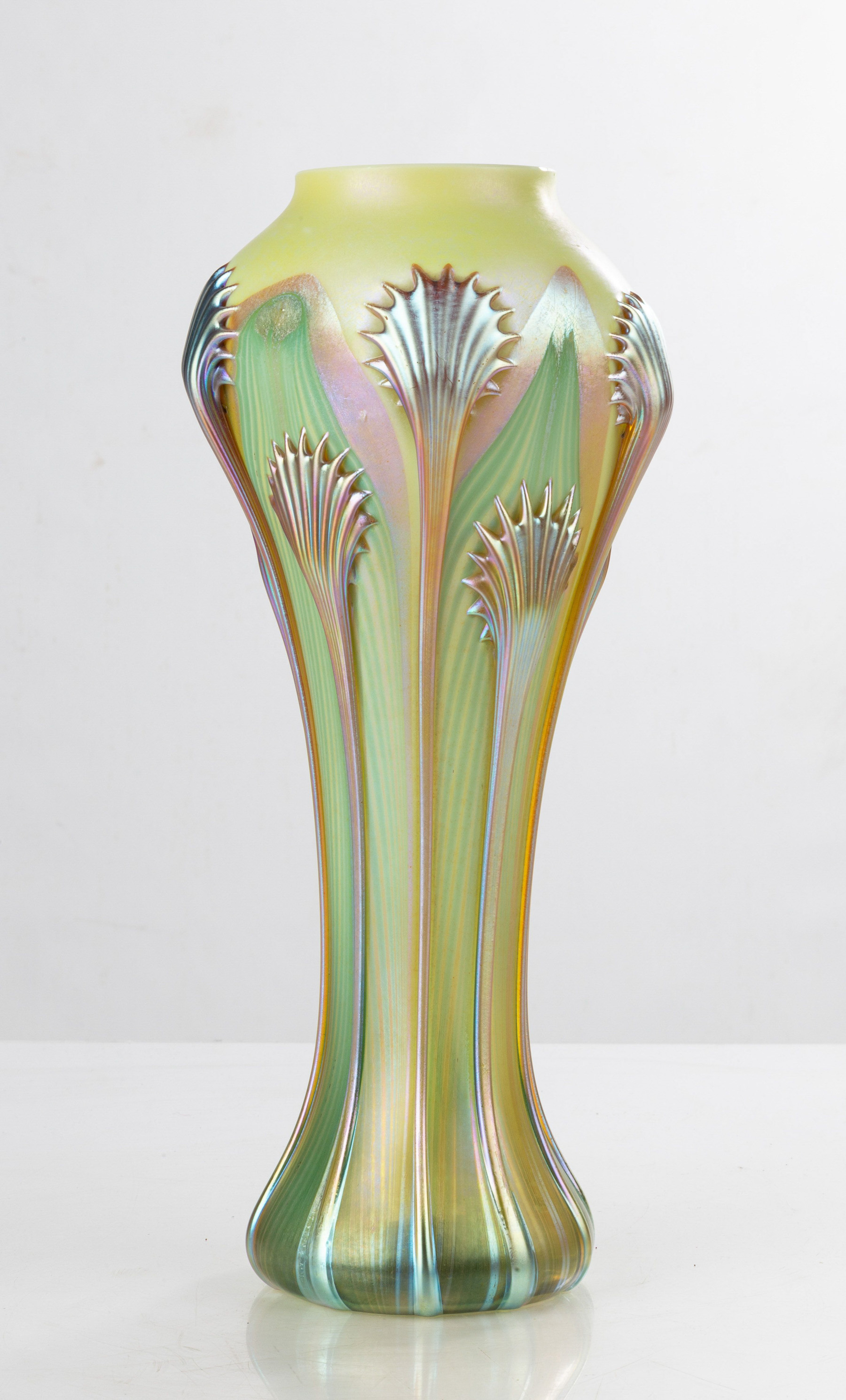 Quezal Art Glass and Decorating Company, early 20th century. Hand-blown glass with applied iridescent tendrils. Unsigned. |