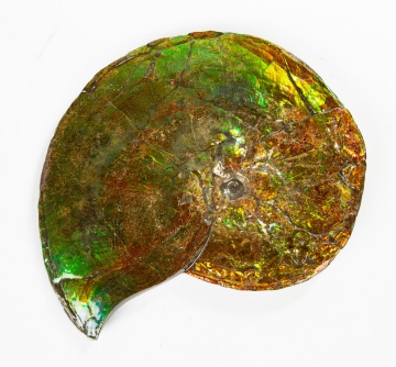 From the Upper Cretaceous Bearpaw formation (75-72 million years ago). Gem ammonite with hints of blues and purples on both sides and also has areas with reds, oranges, golds, and greens. A highly sought after combination of colors considering purple and blue are the most uncommon iridescent colors of ammolite. Note: The opal-like iridescence of these ammonites from Alberta, Canada has been termed "ammolite," and since 1981 has had the status of a gemstone. The shimmering, metallic colours were caused by the combination of millions of years of compression and the mineralization of iron, copper, and silica which precipitated from volcanic ash. The opalescent layers of colour are particularly prized in the Chinese philosophical system of Feng-Shui. The ammonites are a group of molluscs that lived in the seas from the mid-Devonian (approximately 400 million years ago) to the end of the Cretaceous (65 million years ago). The sequence of events that famously killed off the dinosaurs also drove the ammonites to extinction. |