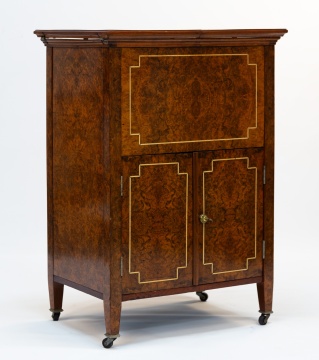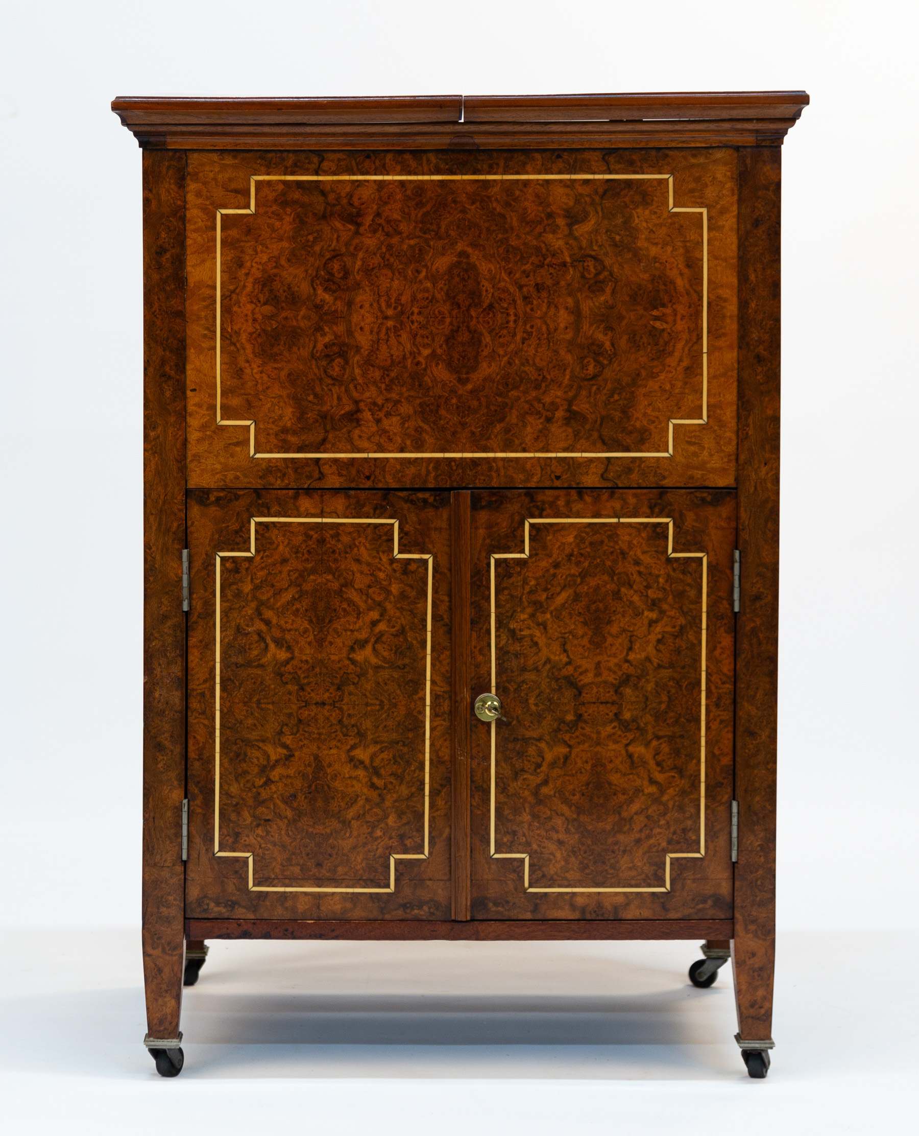 | Mid-century. Walnut and burl with satinwood inlay. Includes cut glass tumblers, stemware, and decanters. |