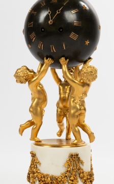 19th century. Gilt bronze, marble, and painted metal. Globe has applied stars. 8-day time and strike balance wheel movement. |
