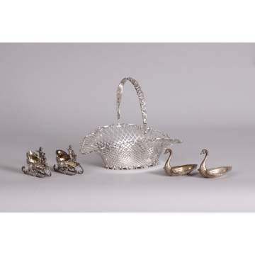 | Lot 43: Two Sterling Sled Salts. 3.6 Troy oz. (together). One missing glass insert, very good. Ht. 2 1/2" W 3 1/2" D 1 1/2" Est. $200-$300 Lot 43A: Gorham Sterling Swan Salts. Marked Gorham, Sterling on underside. 2.2 Troy oz. Excellent. Ht. 2 3/4" W 3 1/2" D 2 1/2" Est. $150-$250 Lot 44: Sterling Basket. Monogrammed on interior, dated 1903 on bottom. 13.1 Troy oz. Excellent. Ht. 3 1/2" (w/o handle) W 10 1/2" D 7" Est. $400-$600 |