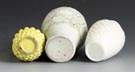 | Porcelain, corncob, Ht. 3"; Porcelain baluster shaped bottle decorated with a basket/net, Ht. 3 1/2"; White Glass, bud shaped, Ht. 2 1/4" |