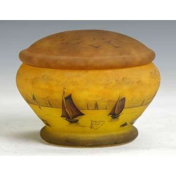 | Sgn. Daum Nancy. Decorated w/sailboats & harbor, birds in flight on lid. |