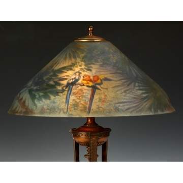 Pairpoint Reverse Painted Lamp w/4 Parrots & Tropical Landscape