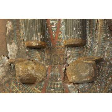 | C. 1069-945 BC. Upper half of the lid to an inner coffin. Clenched hands, striped wig, member of the priesthood. Three cartouches by the hands read: Osiris, Ruler; Djeserkare; Amenhotem (Ruler of) Thebes. |