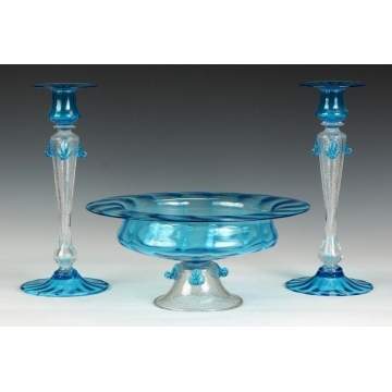 | Lot #: 810 Steuben Celeste Blue & Clear Mica Fleck Glass Compote & Matching Candlesticks |