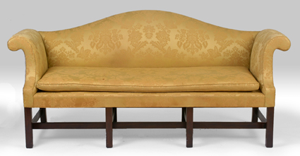 mahogany Chippendale camelback sofa in orig. finish and upholstery. vg 36" ht., 79" w., 30"d