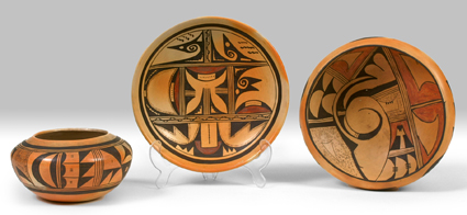 polychrome pot w/some paint loss and wear, otherwise vg., marked w/paper label "Hopi, genuine American Indian pottery; The Flume Reservation; Franconia Notch NH"