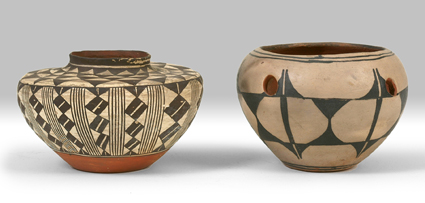 polychrome geometric pattern, paint loss to rim, otherwise vg 4 1/2" ht. 7 1/4" diam.