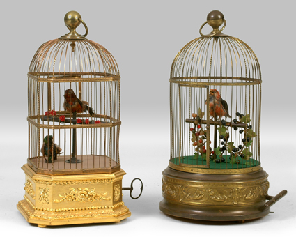 over gilded carved wood base w/embossed brass cage, working order, needs adjustment. vg 21 1/2" ht. 10"w. 10"d