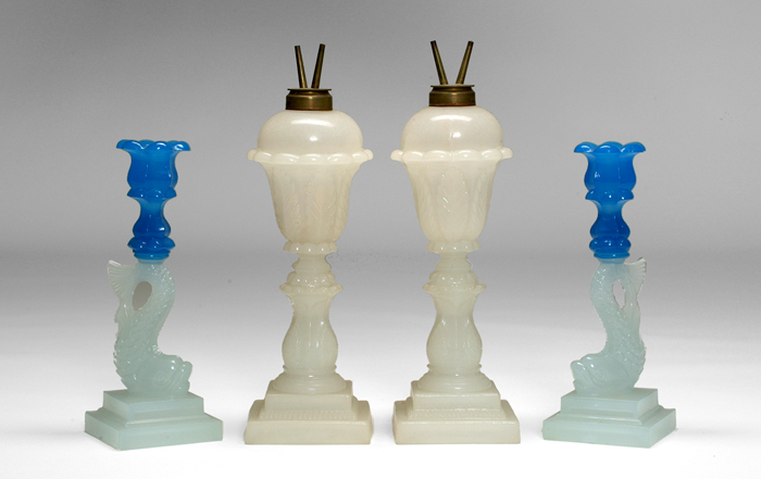 (outside) Clam Broth & Blue Sandwich Glass Dolphin Candlesticks