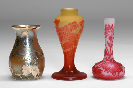 iridized glass w/floral vine silver overlay exc 4 3/4"ht. 3" diam