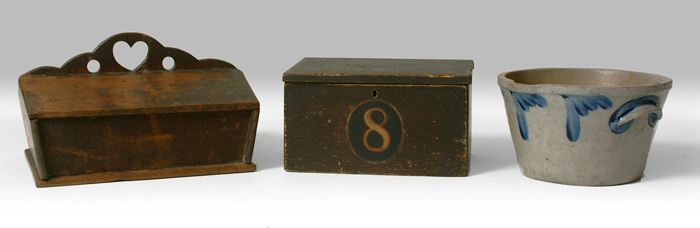 w/heart cutout handle, orig. condition and finish vg 8" ht. 13 1/4" w 10 3/4" diam