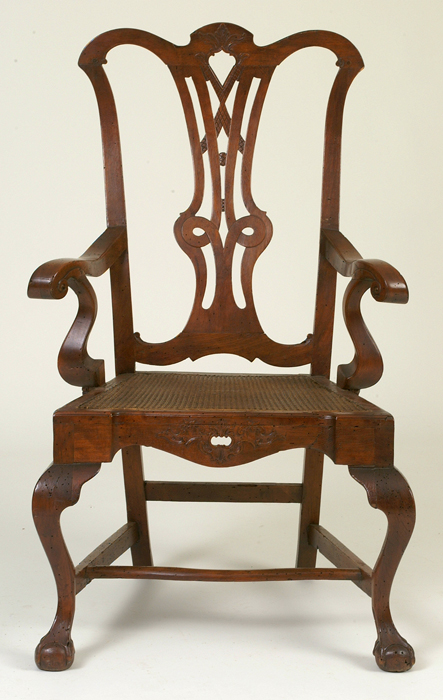carved walnut armchair w/cane seat, old patina, old repairs vg 42" ht. 24" w 20" d