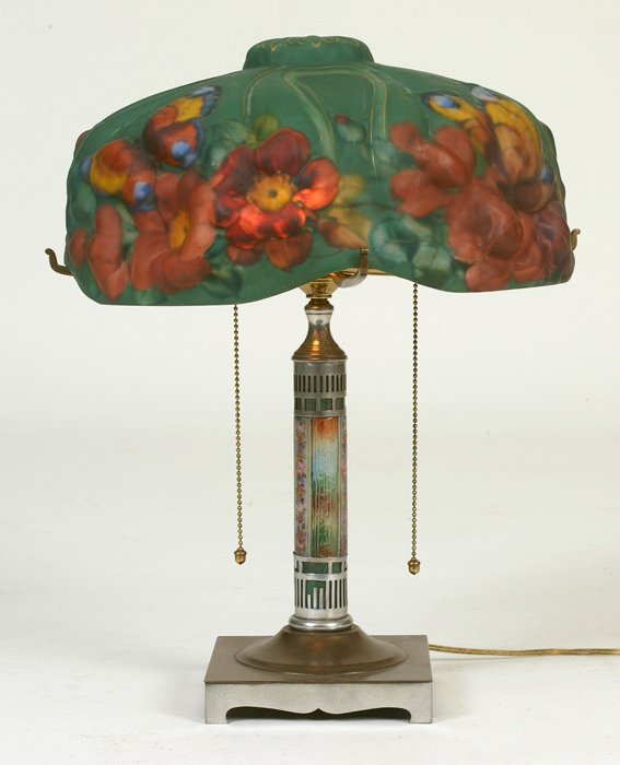 closed top, rose & butterfly w/ painted & enameled glass base, signed base & shade vg 18 1/2'' ht. 14'' shade diam.