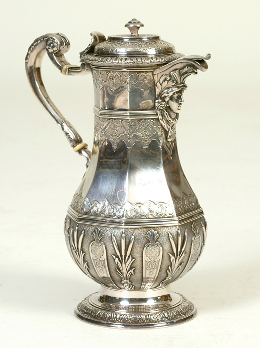 repousse work w/ masked spout, marked Cardeilmac Paris, wt. 26.2 Am.ozs exc 8 3/4'' ht. 5 1/2'' w