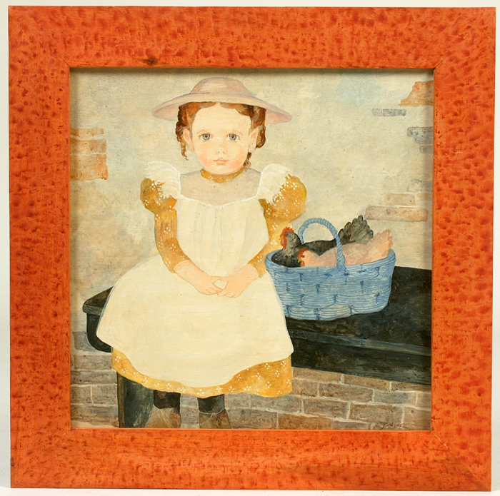 girl w/ basket of hens, paint decorated frame exc 15'' ht. 15'' w