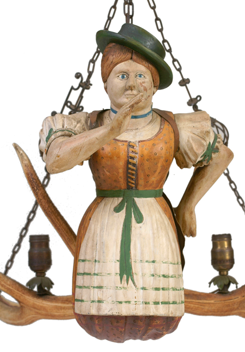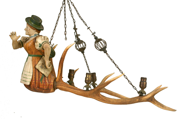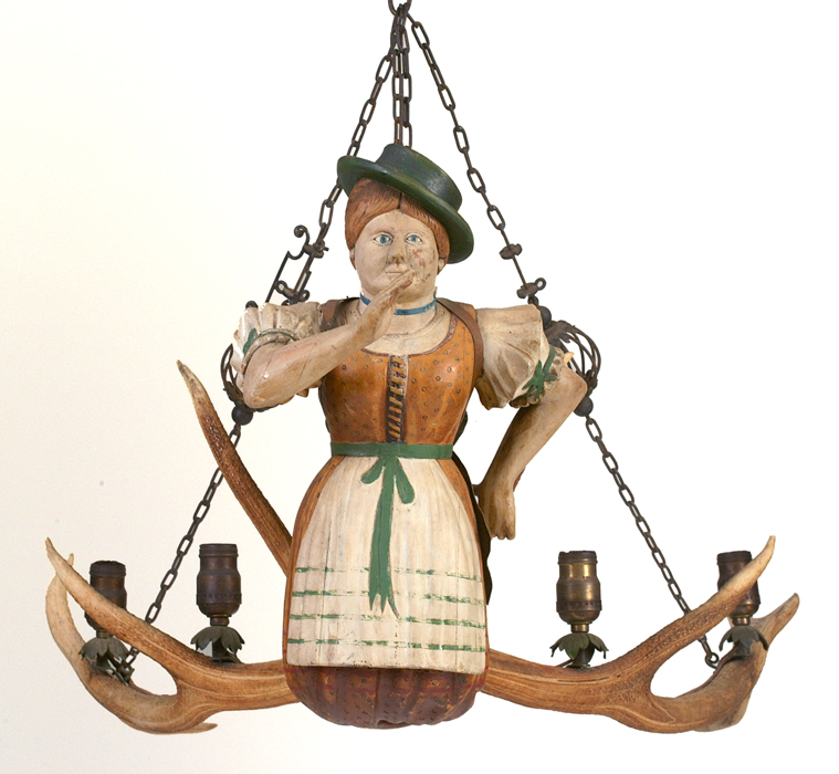 carved wood pt.decorated figural an horn, 4 light electric chandelier in orig. pt., some minor pt. loss, circa 1900 Upstate NY