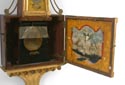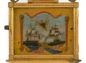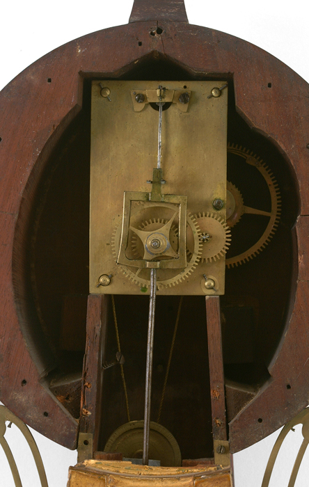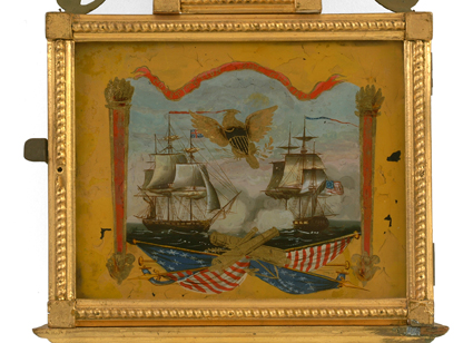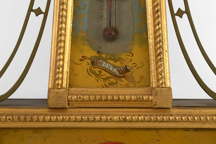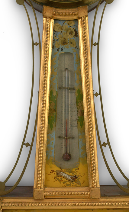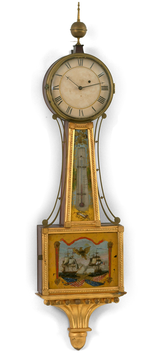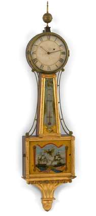 mahogany case w/gilt front, presentation banjo, orig painted iron dial, orig. rev. ptd. throat tablet w/thermometer, Sgn. N Monroe, bottom tablet w/ the Constitution and Gurriere, 8 day time only brass wgt. driven movement. vg 43"ht. 11"w