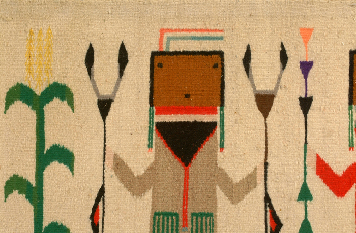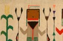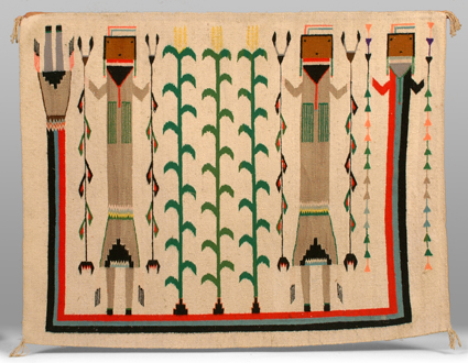 3 yellow figures holding pairs of feathers, vg cond. vg 42 1/2"x 53 1/2" Buffalo Estate