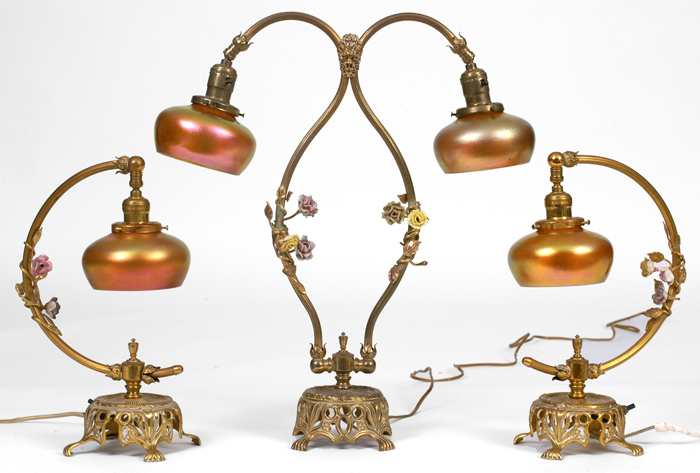 Gilt Brass Enameled Floral 3 pc. Lamp Set
