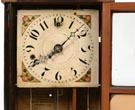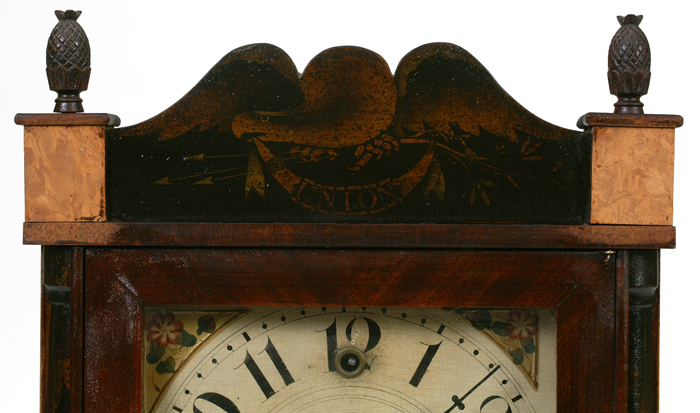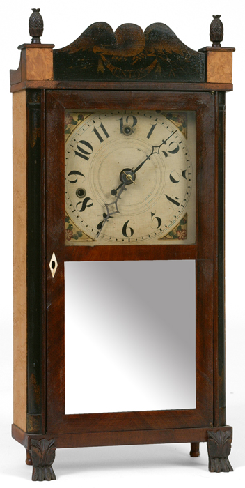 A choice example. Mahogany case in the original finish with original diminutive carved paw feet and pineapple finials. It has tiger maple capitals and birdseye maple grain painted sides. Original stenciled quarter columns and stenciled splat of an eagle and a "Union" banner. Original glass and mirror. This clock was found in central Maine and penciled on the very good label is a note: "Cold today, Jan 15, 1903, 42 below zero". Pre global warming. It has an excellent original painted wood dial with colorful corners. Original hands, pendulum, weights and key. One day timepiece with alarm.