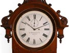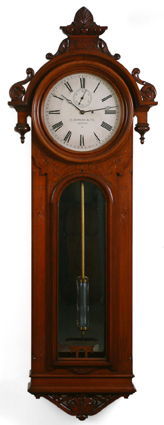 Fine & rare, w/carved walnut case w/incised decoration, original finish & condition, original 14 " painted iron dial, sgn E. Howard & Co. Boston. Original mirror & dead beat escapement, bit second hand. 8-day time only weight driven sgn. E. Howard brass movement w/dead beat escapement. Original cut glass mercury style pendulum. Bit second hand. Retains original weight & key. B. Breed collection.