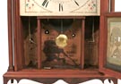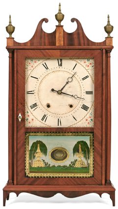 Mahogany case in old patina, original painted wood dial,original tablet w/minor check in lower rt corner, 30 t/s wood works, weight driven movement, original finials, good label, some discoloration. B. Breed collection.