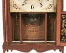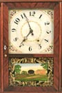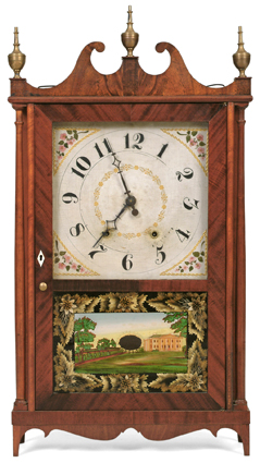 Mark Leavenworth Pillar & Scroll Shelf Clock - Mahogany case in original patina, original painted wood dial and reverse painted tablet, 30 hr t/s wood works weight driven movement, appears to retain original finials, very clean label.