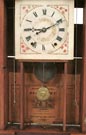 Mahogany case w/gilded 1/2 columns in old patina, original painted wood dial, reverse painted tablet in crest, old mirror. 30 hr. t/s weight driven wood works movement. Nice label & directions. B. Breed collection.
