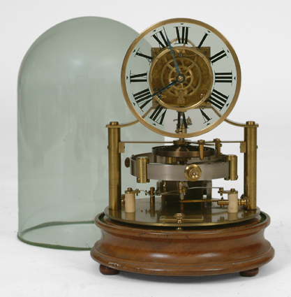 Glass chapter ring w/brass mounts. Movement on raised brass platform with large horizontally mounted balance wheel below, with Hipp toggle system for controlling the impulse all on circular brass bedplate w/plaque inscribed "Electric Clock, made by the Reason Mfg. Co. LTD Brighton". Murday's Patent, concave molded wood base concealing the battery on bun feet. Most imposing of all electrical balance wheel clocks made. One of 300.