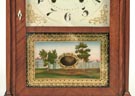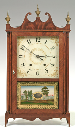 Chauncey Ives Pillar & Scroll Shelf Clock (Bristol, CT)- Mahogany case in deep, rich old patina w/original painted dial, original reverse painted tablet w/old touch-ups, 30 hr t/s weight driven wood works movement, good label. B. Breed collection.
