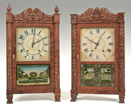 Mahogany case w/carved cornucopia crest, pineapple finials, acanthus leaf 1/2 columns and paw feet, in old patina. Original painted wood dial. Moberg reverse painted tablet. 30 hr t/s weight driven wood works movement. Good label. B. Breed collection.