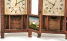 Mahogany case w/carved leaf & fruit crest, acanthus leaf 1/2 columns & paw feet in old patina, original painted wood dial w/minor gold loss. Moberg reverse painted tablet 30 hr t/s weight driven wood works movement, clean label & directions. B. Breed collection.
