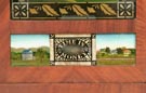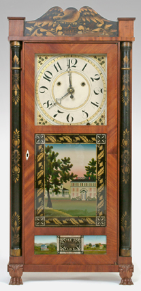 Mahogany case w/original stenciled eagle splat & 1/2 columns w/carved paw feet. Old finish, possibly original. Painted wood dial, center glass original w/professional restoration, original bottom glass reads "Time is Money" 30 hr upside-down t/s alarm, weight driven wood works movement. B. Breed collection.