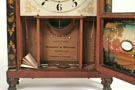 Mahogany case w/original stenciled splat & 1/2 columns, carved pineapple finials & paw feet in original finish, original painted wood dial & reverse painted tablet, 30 hr t/s weight driven wood works movement, good clean label, choice example. Minor loss to leaf on foot. This clock is featured in the Jerome's & Darrow book" Rags to Riches to Rags". B. Breed collection.