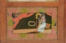 Mahogany case in old patina, w/original finials, original painted wood dial w/outstanding original classical reverse painted tablet of woman playing the harp, 30 hr t/s weight driven wood works movement, good label. w/ photo of house it came from. B. Breed collection.