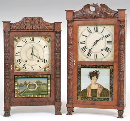 Mahogany case w/carved eagle crest, acanthus leaf 1/2 columns & paw feet in old patina. Original painted wood dial. Moberg reverse painted tablet. 8 day t/s weight driven wood works movement. Good label & directions. With purchase account history. B. Breed collection.