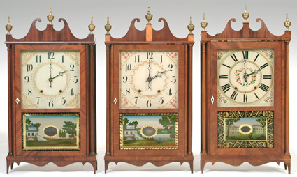 Mahogany case in old patina w/original finials, original painted wood dial, Moberg reverse painted tablet, 30 hr t/s weight driven wood works movement. Clean label. B. Breed collection.