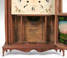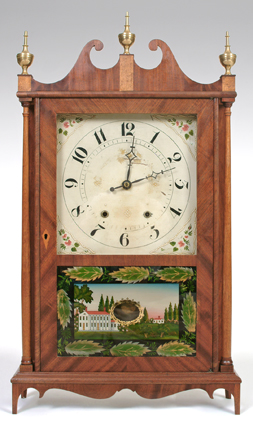 Mahogany case in old patina, original painted wood dial appears to retain it's original tablet w/some touch-up, 30 hr t/s weight driven wood works movement. Professional restoration to crest. B. Breed collection.
