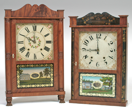 Mahogany case w/original stenciled splat in old patina, original painted wood dial & period reverse painted tablet. 30 hr t/s weight driven mahogany plate wood works movement. Good label. B. Breed collection.
