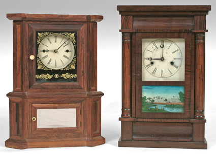 Rosewood grained case w/1/2 column in old finish. Original painted metal dial w/some touch up. 30 hr spring drived brass movement Original reverse painted tablet. (missing door knob).