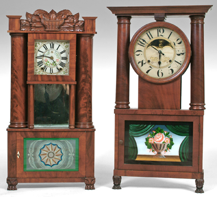 Mahogany case (crown restored) Full columns & carved paw feet in old patina, original painted wood dial (small touch-up) Reverse painted tablet. 8 day strap brass weight driven movement.