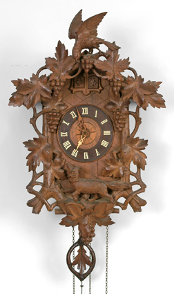 Black Forest Carved Cuckoo Clock- Carved walnut case w/bird, grapes, leaves, branches & fox decoration, nice old finish, retains original pine cone weights & wood pendulum.
