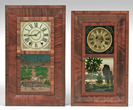 Mahogany bevel case in old patina, veneer repair to the door, Original painted wood dial, Original reverse painted tablet (cracked w/paint loss), 30 hr t/s wood works weight driven movement. A similar example shown in research activities & news- NAWCC Bulletin June 2004. Good label w/overpaste by S. Cable, 424 GRand St. corner Attorney St. New York. B. Breed collection.