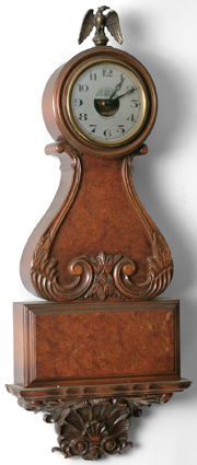 Carved mahogany case w/burl veneer in original finish. Sgn. silvered metal dial. Movement Involves a stationary coil & swinging magnet.