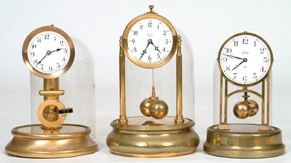 Brass base, glass dome. Original patina, enameled dial. Electo-mechanical battery powered clock w/unique mercury switched movement.