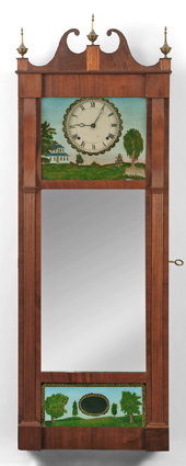 Mahogany case in old patina, replaced painted metal dial, original reverse painted top tablet. Repainted lower reverse painted tablet. Mirror not original. 8 day t/s brass weight driven movement.