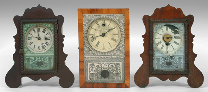 Mahogany cigar box style case, original sgn painted metal dial. Original full door reverse painted tablet w/back strengthened. 30 hr time only spring driven movement. Good label.
